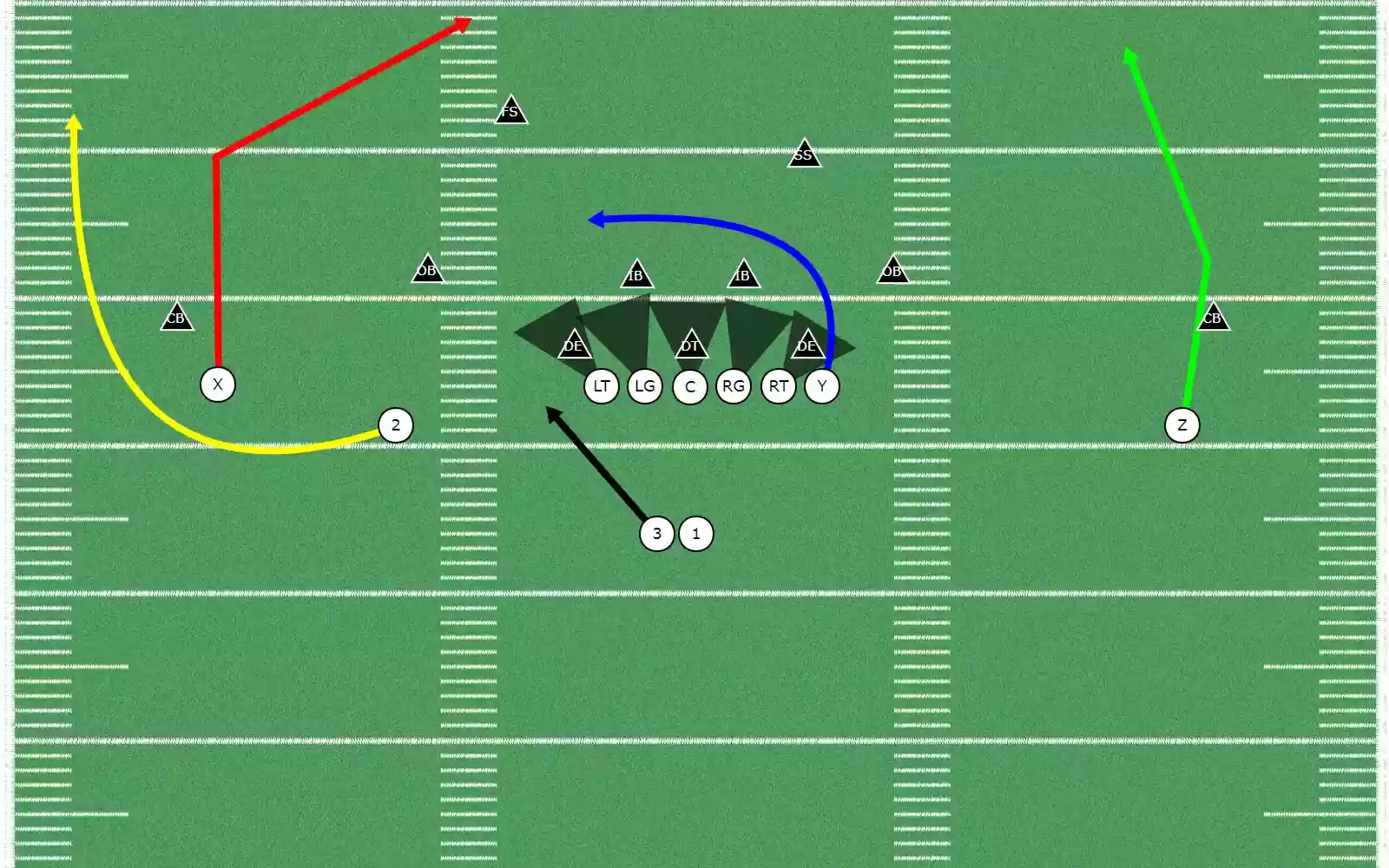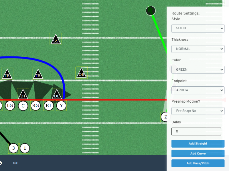 You can draw any type of route you would like, straight lines, curved lines, zone blocking and even zone defensive routes. You can also change the color, labels, and even shape of your players